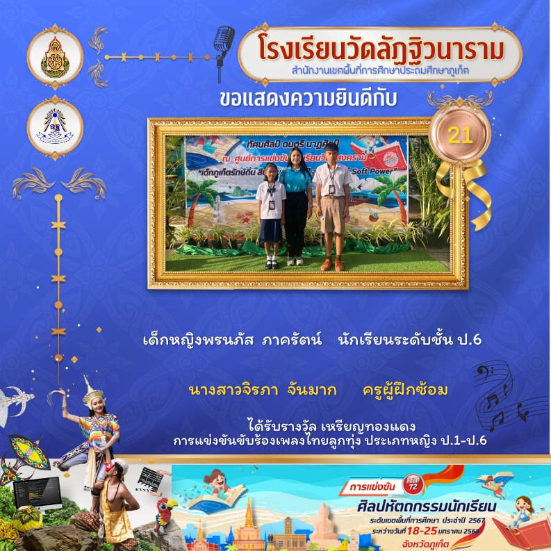 รางวัล เหรียญทองแดง การแข่งขันขับร้องเพลงไทยลูกทุ่ง ประเภทหญิง ป.1-ป.6