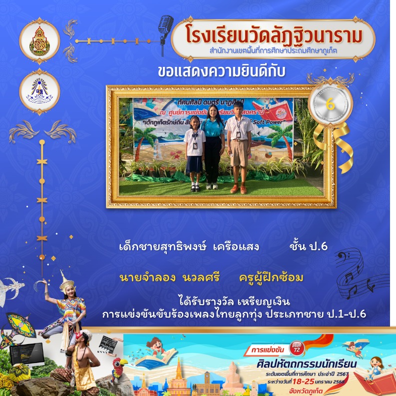 รางวัล เหรียญเงิน การแข่งขันขับร้องเพลงไทยลูกทุ่ง ประเภทชาย ป.1-ป.6